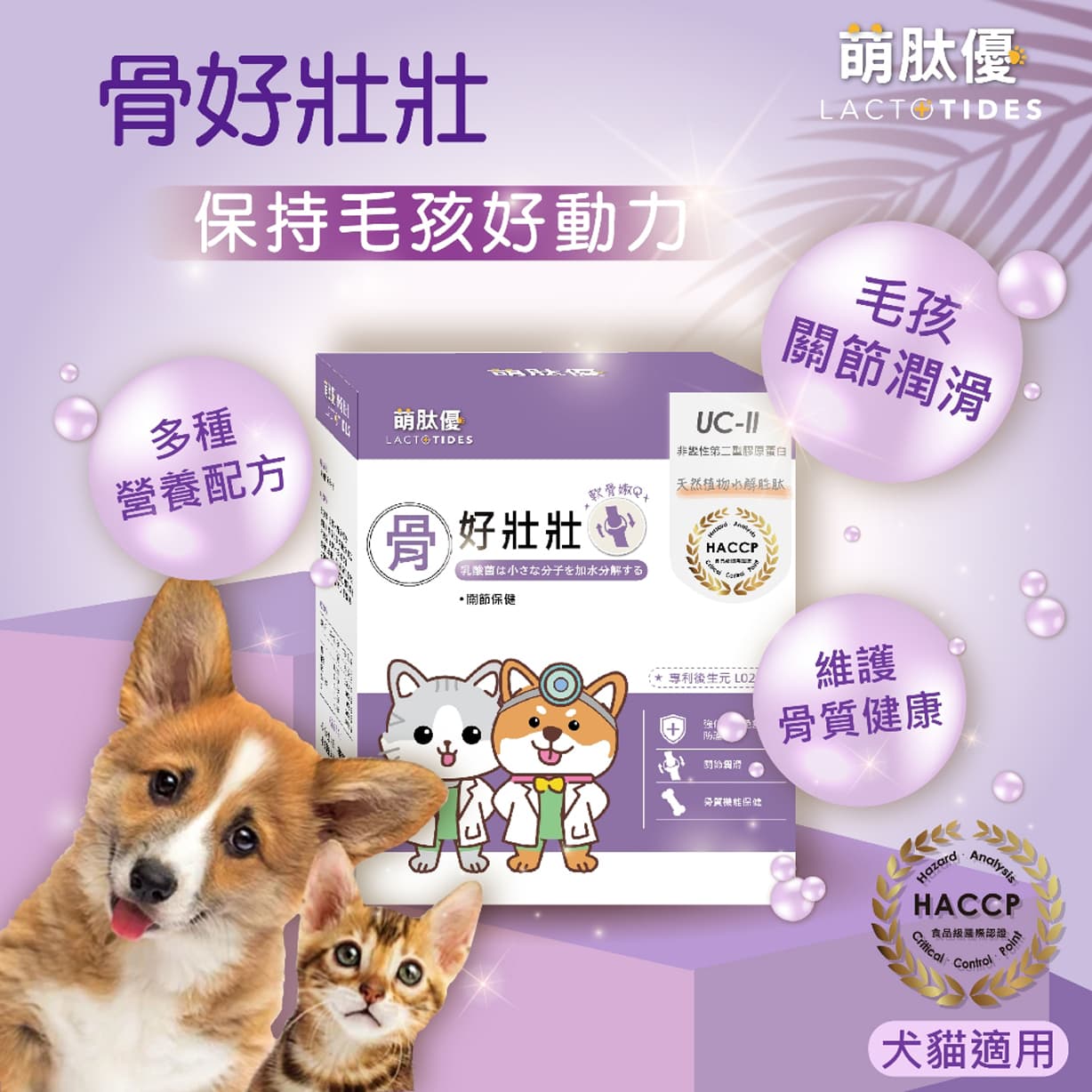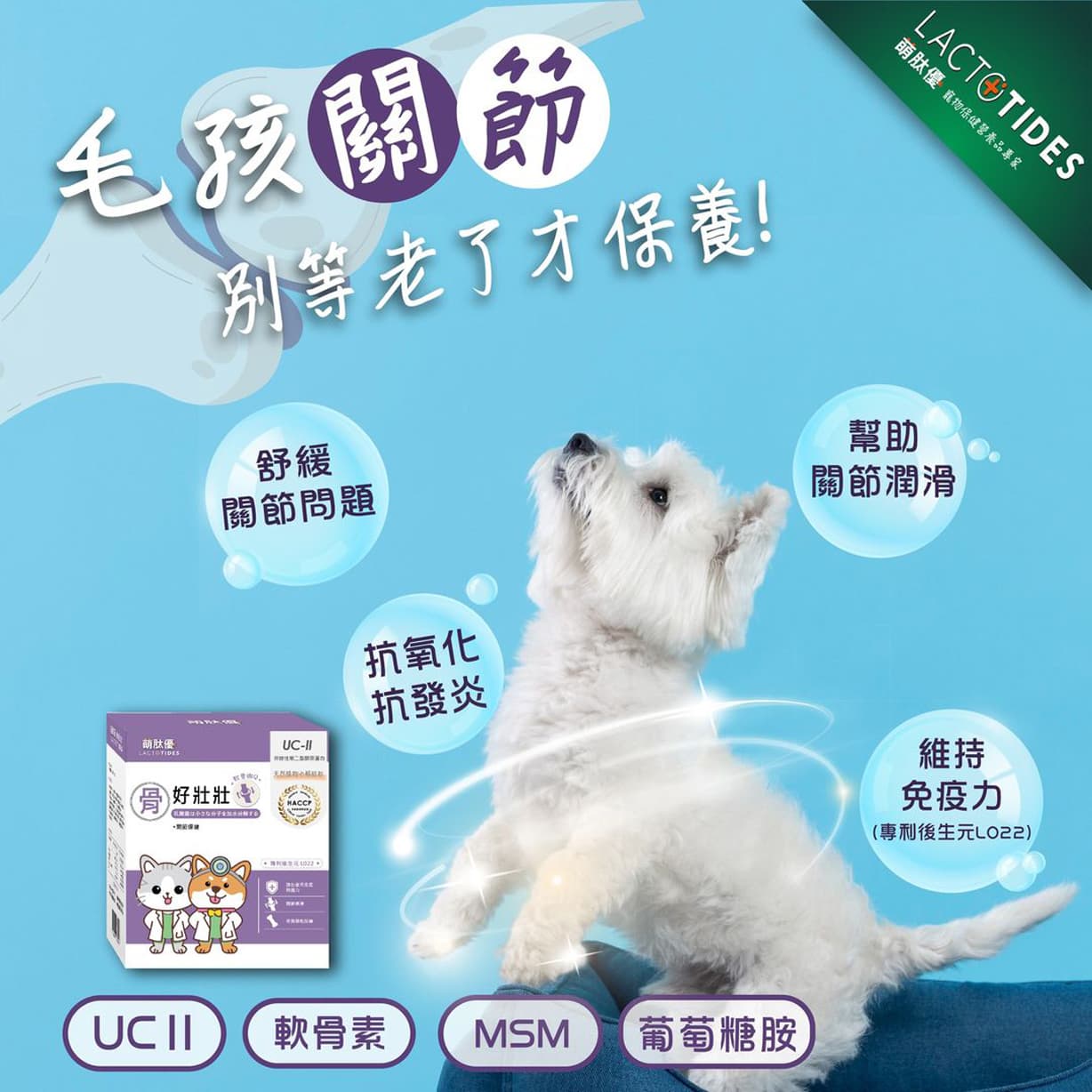 萌肽優 骨好壯壯 寵物關節保健品,添加 UCII、MSM、軟骨素與葡萄糖胺等關節保護配方,幫助狗狗潤滑關節、維持動力,並採用專利後生元 L022 與天然植物性胜肽,讓狗狗維持免疫力、身體更好吸收營養!
