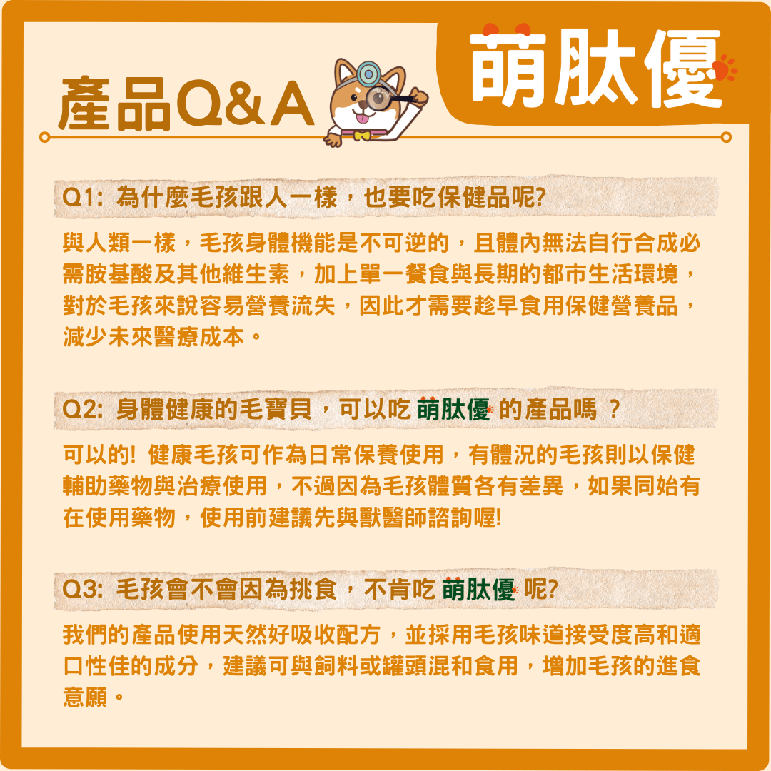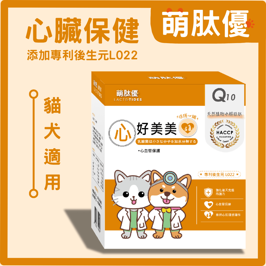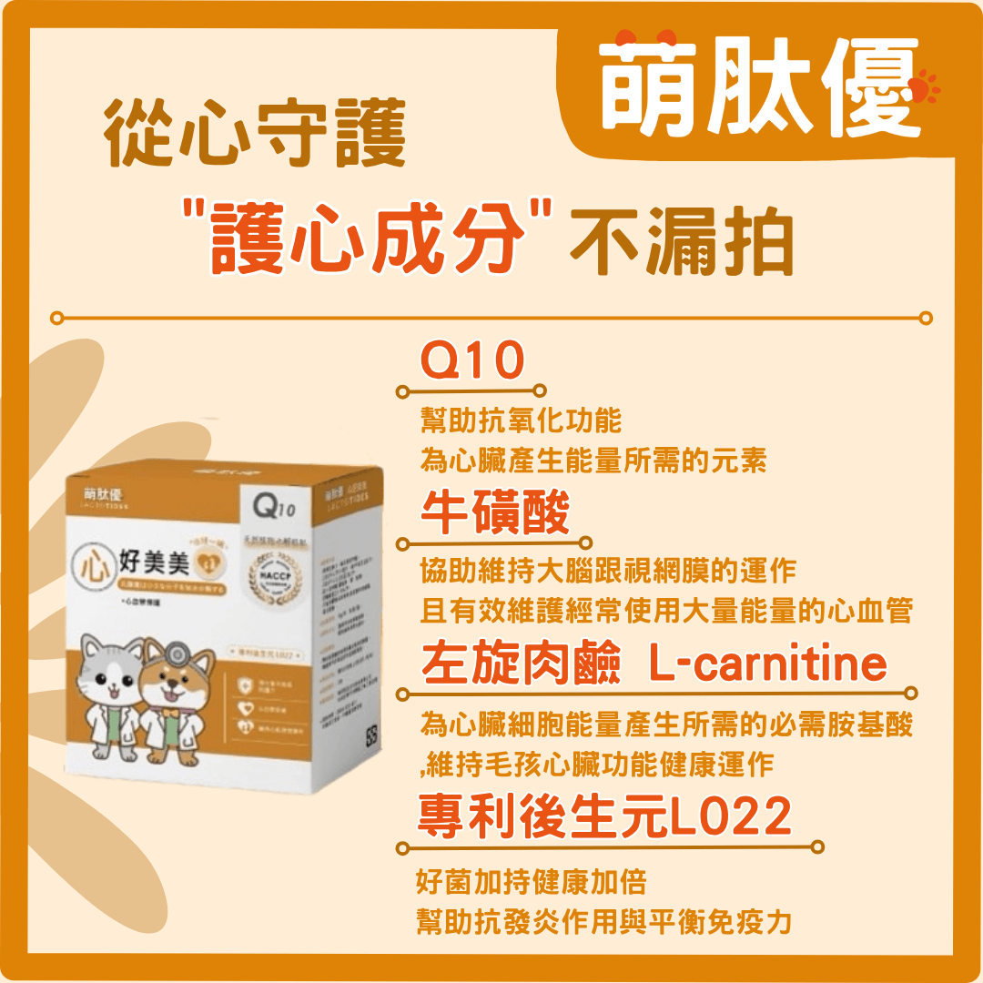 A4:萌肽優提供的配方結合專利後生元 L022 搭配 Q10、牛磺酸與左旋肉鹼,打造多重營養補充,一次守護心肌能量、免疫平衡與心血管健康,屬於全方位的寵物心臟營養補充品。