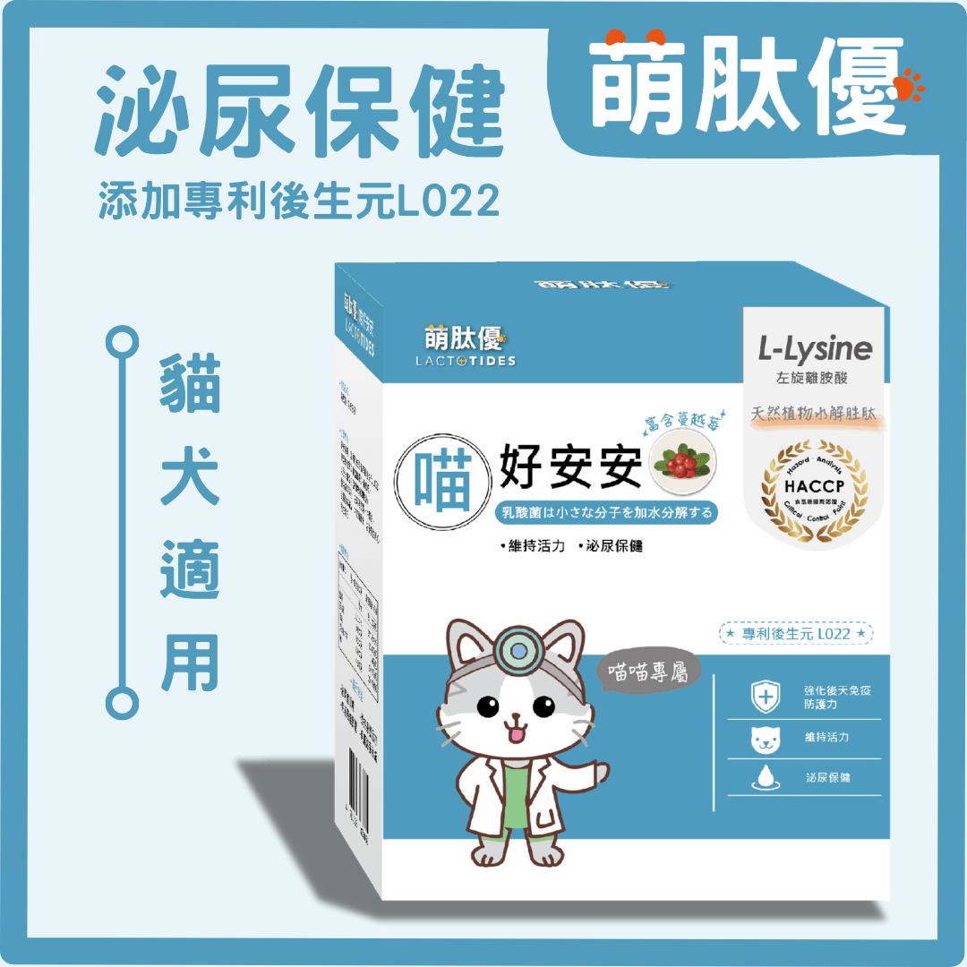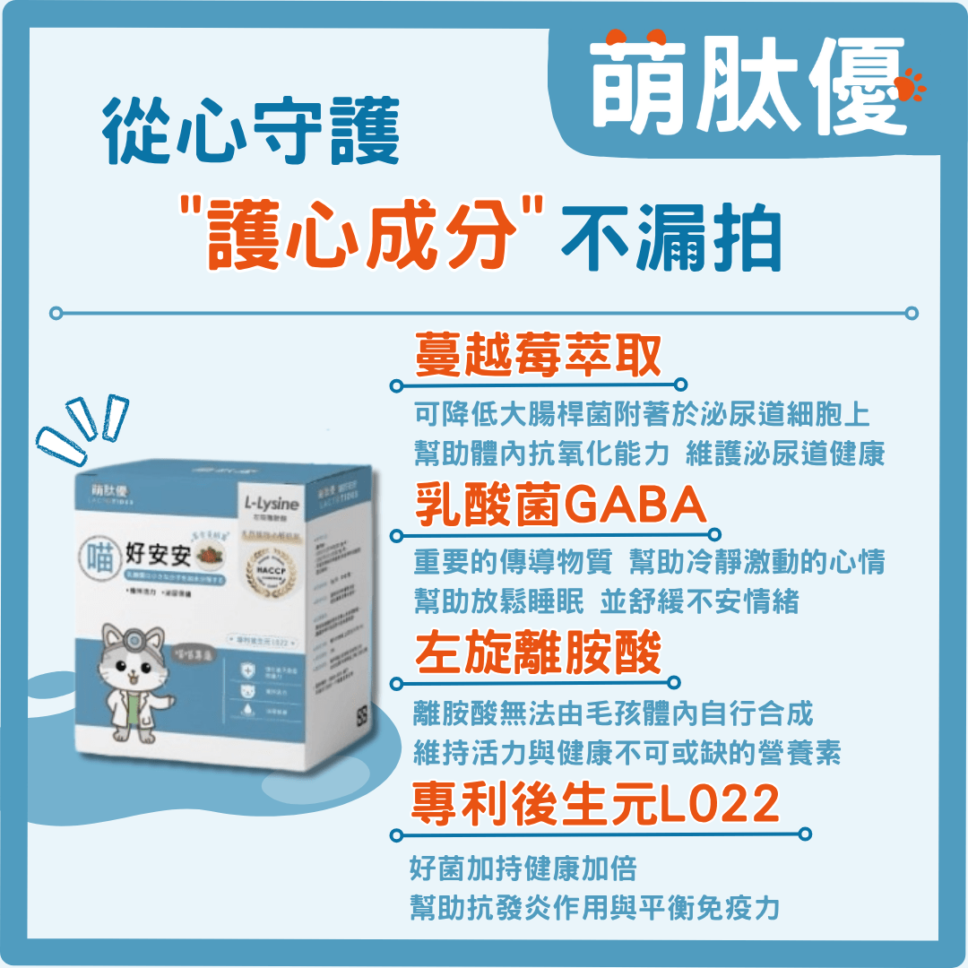 喵好安安結合蔓越莓、L-Lysine、GABA 與專利後生元 L022,從泌尿健康、免疫力到情緒管理全面守護。