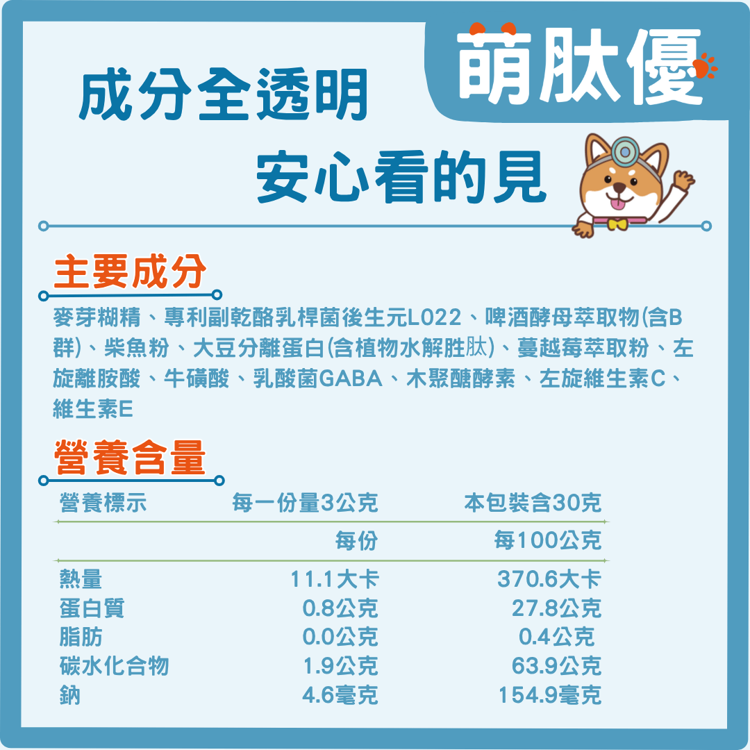 - 成分:麥芽糊精、專利副乾酪乳桿菌後生元 L022、啤酒酵母萃取物 (含 B 群)、柴魚粉、大豆分離蛋白 (含植物水解胜肽)、蔓越莓萃取粉、左旋離胺酸、牛磺酸、乳酸菌 GABA、木聚醣酵素、左旋維生素 C、維生素 E