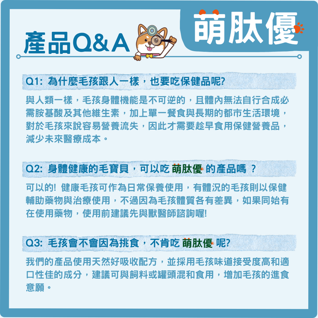 A5:建議毛孩 6 個月齡以上即可開始補充,作為日常泌尿與免疫保健。若是高風險族群(如公貓、泌尿道較敏感的品種),可以更早與獸醫討論是否需要提早開始補充。