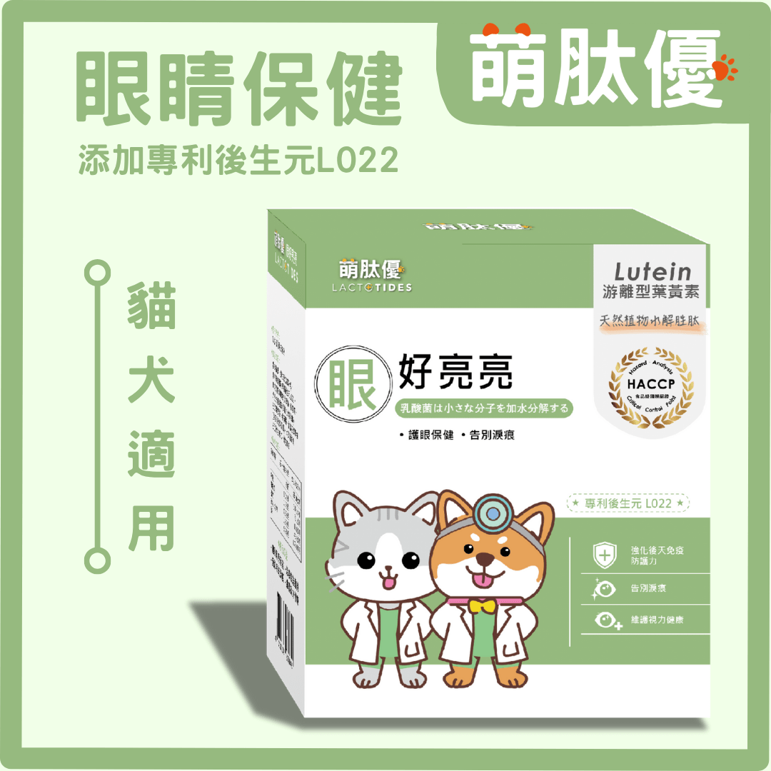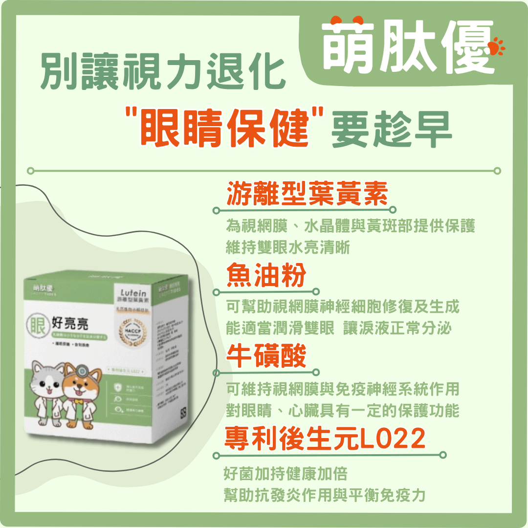 A4:由台灣專業生技團隊研發,結合游離型葉黃素、魚油(含DHA)、牛磺酸與專利後生元 L022,打造多重配方,全面守護毛孩眼睛健康。不同於一般市售的單一護眼產品,眼好亮亮屬於完整的犬貓護眼營養補充品,效果更全面。