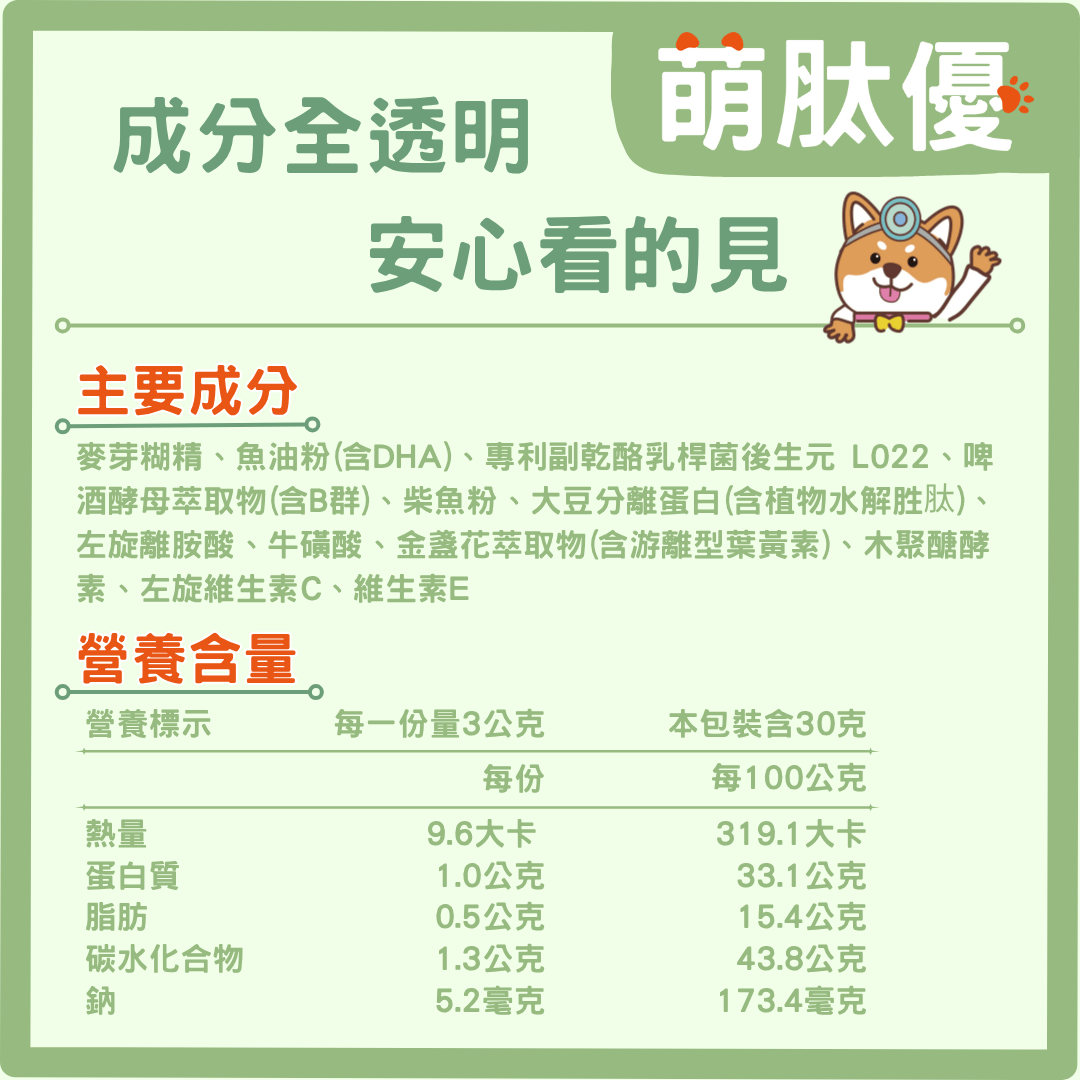 - 成分:麥芽糊精、魚油粉 (含 DHA)、專利副乾酪乳桿菌後生元 L022、啤酒酵母萃取物 (含 B 群)、柴魚粉、大豆分離蛋白 (含植物水解胜肽)、左旋離胺酸、牛磺酸、金盞花萃取物 (含游離型葉黃素)、木聚醣酵素、左旋維生素 C、維生素 E