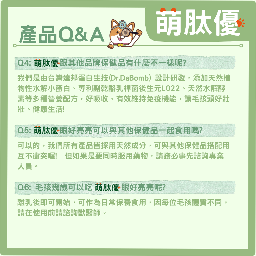 A6:建議毛孩在離乳後即可補充護眼營養,幫助眼部發育與維護。特別是長毛貓、淚痕明顯的犬種(如馬爾濟斯、博美、比熊),更適合及早開始護眼保健。