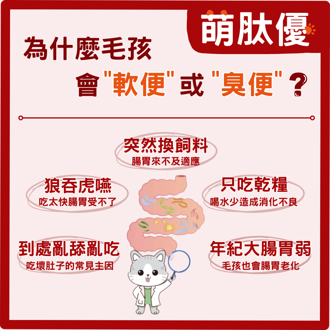 A5:若毛孩持續出現腹瀉、便秘或嘔吐等症狀,可能不是單純菌叢問題,而是疾病或寄生蟲造成的。此時建議立即就醫檢查,再搭配寵物腸胃保健食品做日常護理,效果會更好。