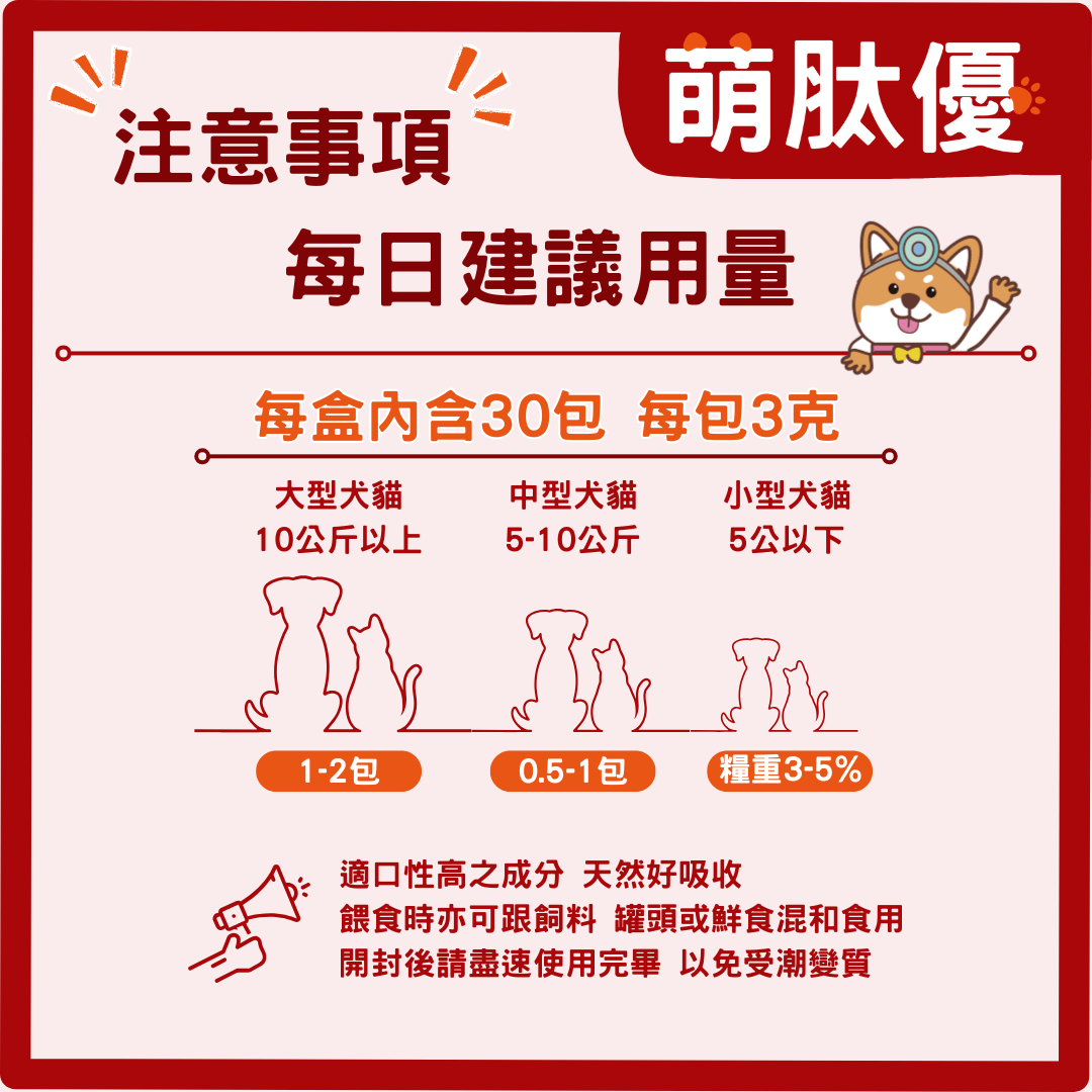- 小型犬貓(5 公斤以下):依日糧重量 3-5% 添加