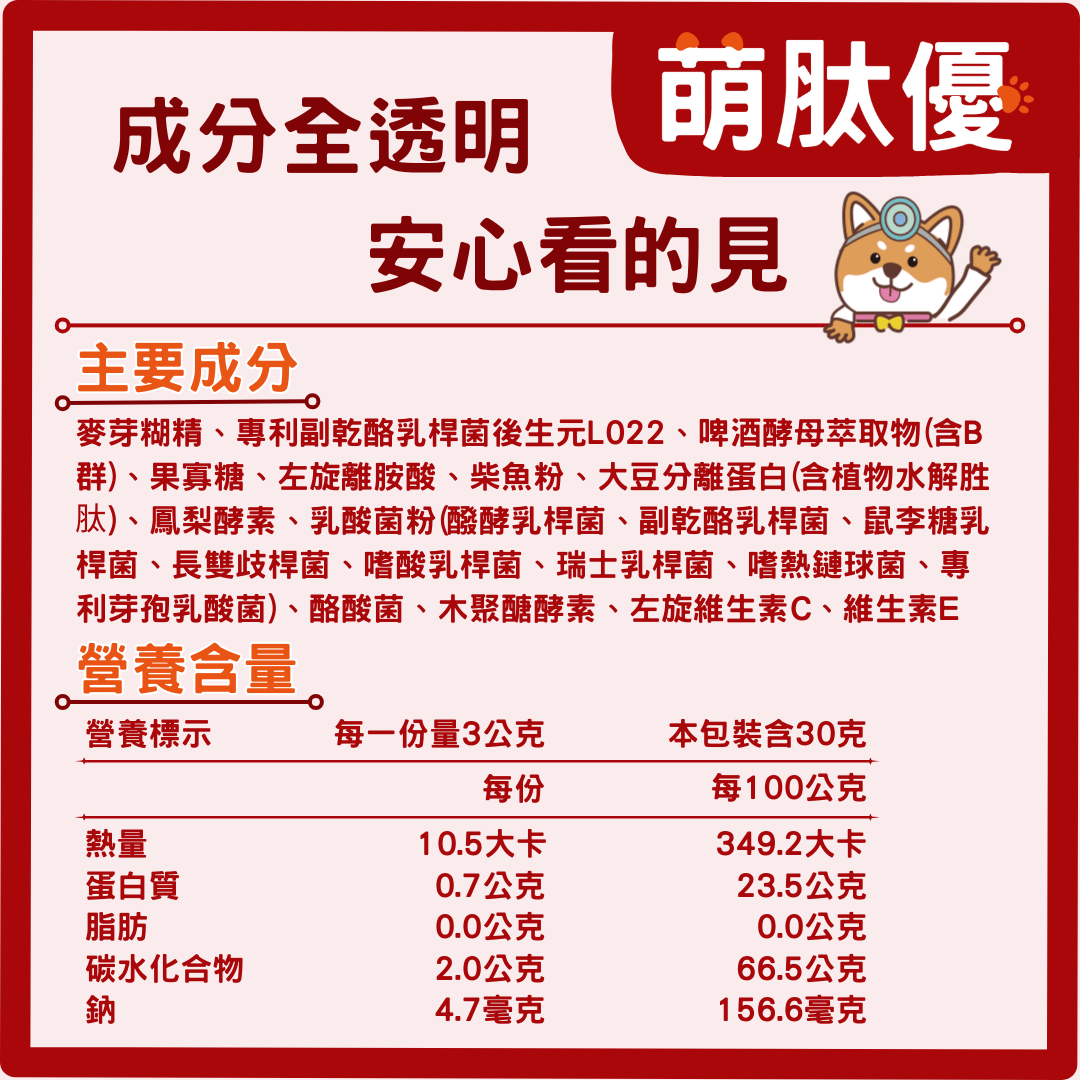 - 成分:麥芽糊精、專利副乾酪乳桿菌後生元 L022、啤酒酵母萃取物 (含 B 群)、果寡糖、左旋離胺酸、柴魚粉、大豆分離蛋白 (含植物水解胜肽)、鳳梨酵素、乳酸菌粉 (醱酵乳桿菌、副乾酪乳桿菌、鼠李糖乳桿菌、長雙歧桿菌、嗜酸乳桿菌、瑞士乳桿菌、嗜熱鏈球菌 、專利芽孢乳酸菌)、酪酸菌、木聚醣酵素、左旋維生素 C、維生素 E
