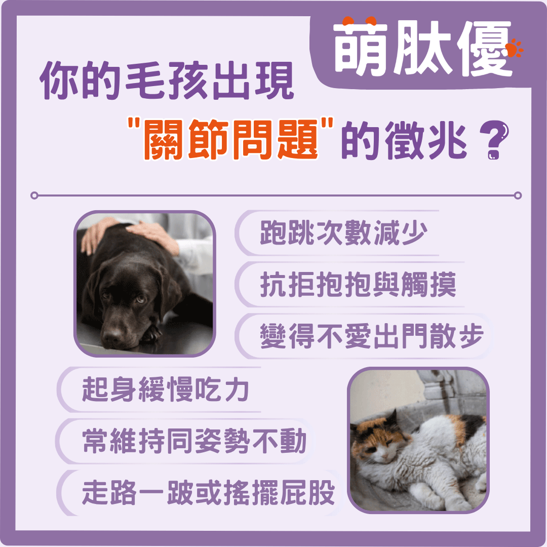 A1:隨著年齡增長,毛孩關節軟骨會逐漸磨損,常見關節僵硬、上下樓困難或行動不便。及早補充寵物關節保健食品,能維持關節靈活度,減少退化風險,也能降低日後高額醫療負擔。