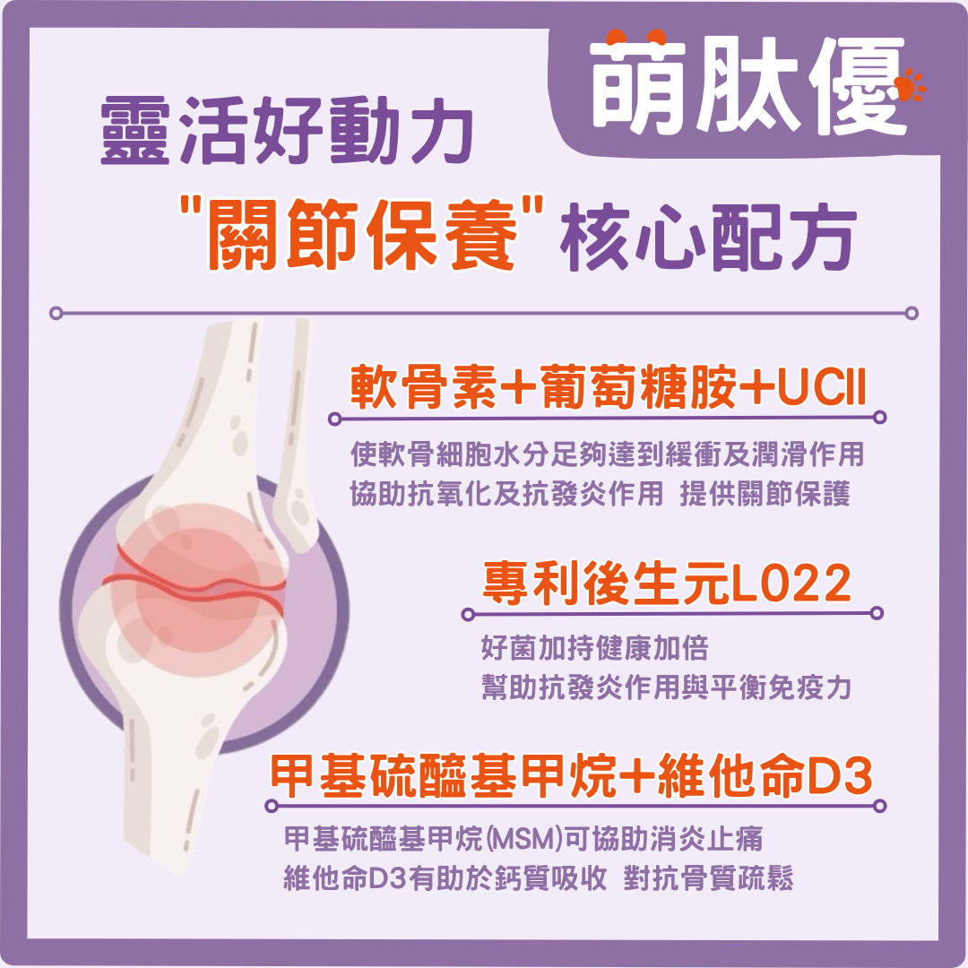 - 綜合多重營養素,維持毛孩關節健康與行動力