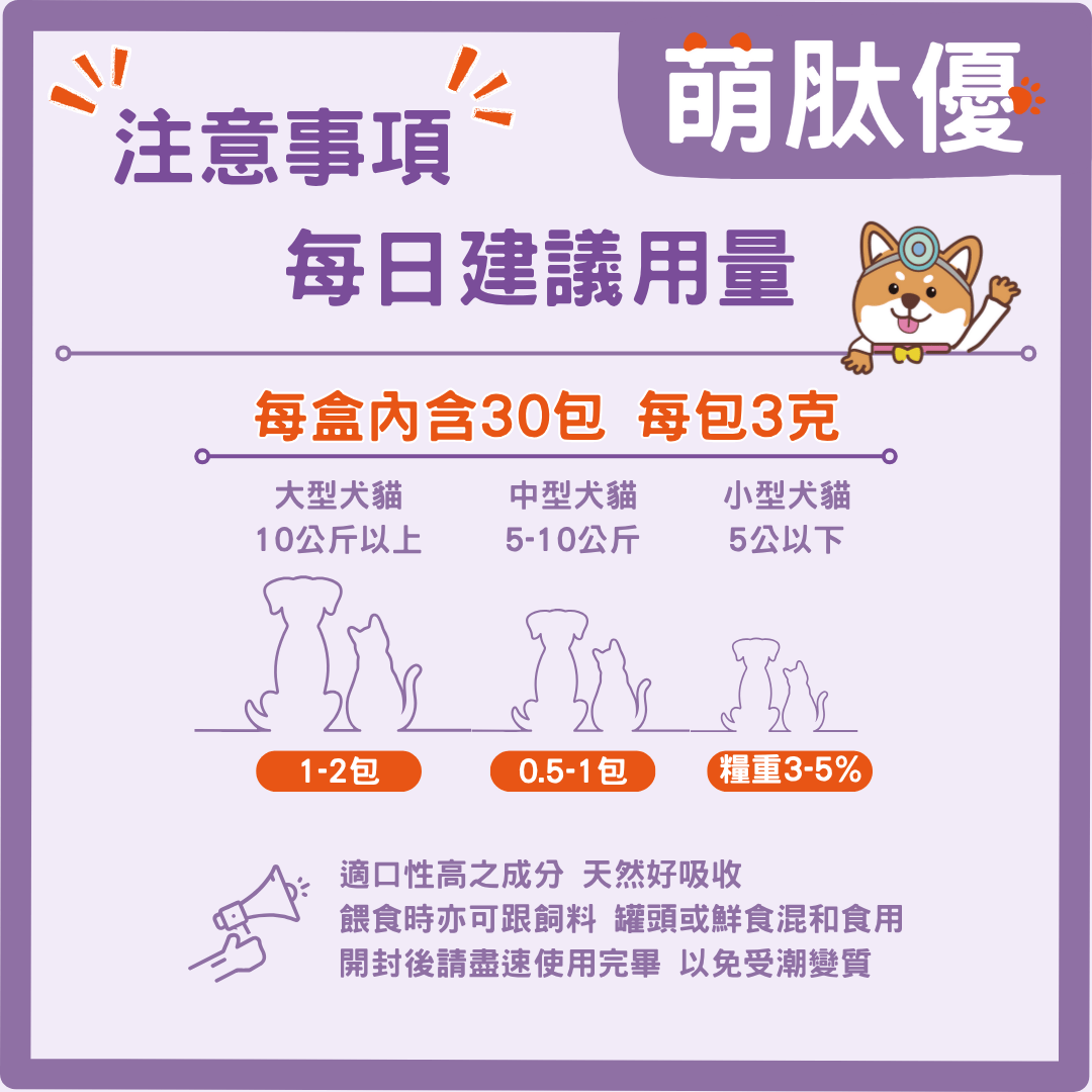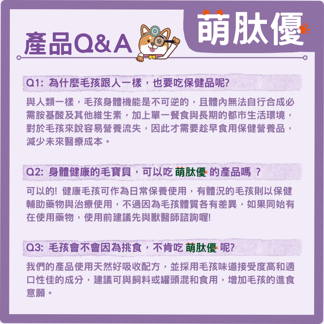 A6:毛孩在離乳後即可開始補充,幫助成長發育與骨骼健康。特別適合大型犬、活動量大的狗狗,或容易有關節問題的品種(如柯基、黃金獵犬、英短貓),提早補充效果更好。