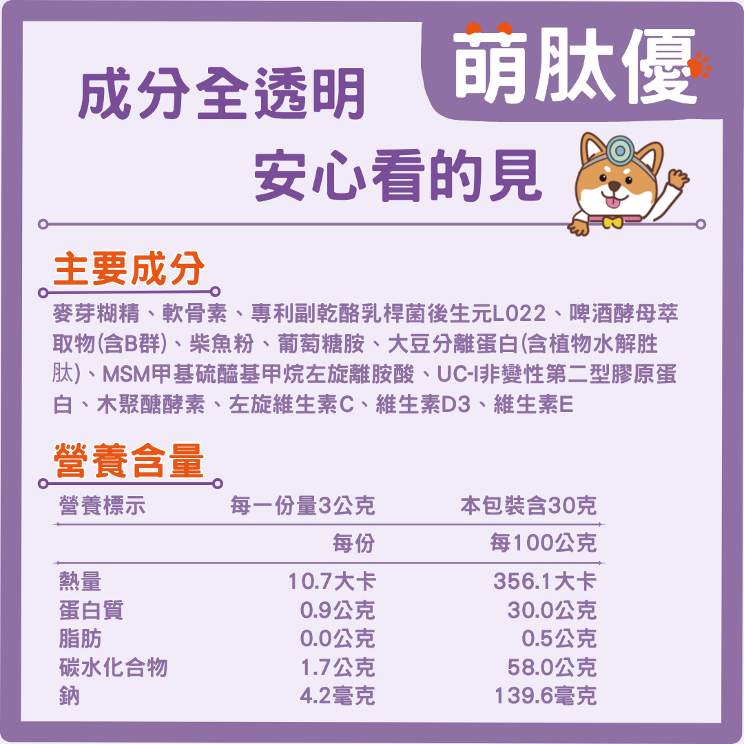 - 成分:麥芽糊精、軟骨素、啤酒酵母萃取物 (含 B 群)、專利副乾酪乳桿菌後生元 L022、葡萄糖胺、柴魚粉、大豆分離蛋白 (含植物水解胜肽)、MSM 甲基硫醯基甲烷 、左旋離胺酸、UC-II 非變性第二型膠原蛋白、木聚醣酵素、左旋維生素 C、維他命 D3、維生素 E