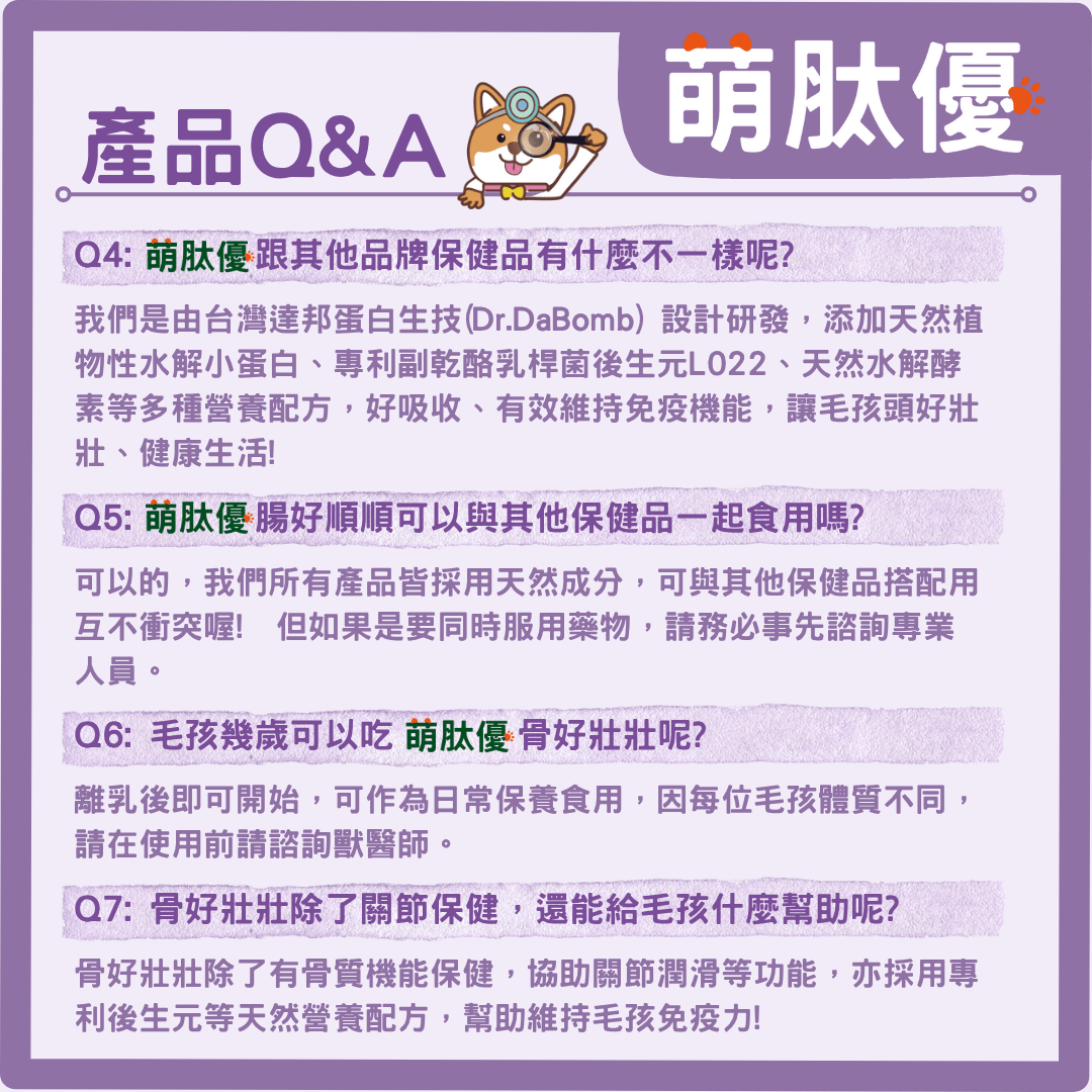 A7:有的!除了可以進行狗狗與貓的關節營養補充,骨好壯壯還能幫助維持免疫力、促進皮膚與毛髮健康,全面提升毛孩活力,讓毛孩不只動作靈活,整體狀態也更有精神。