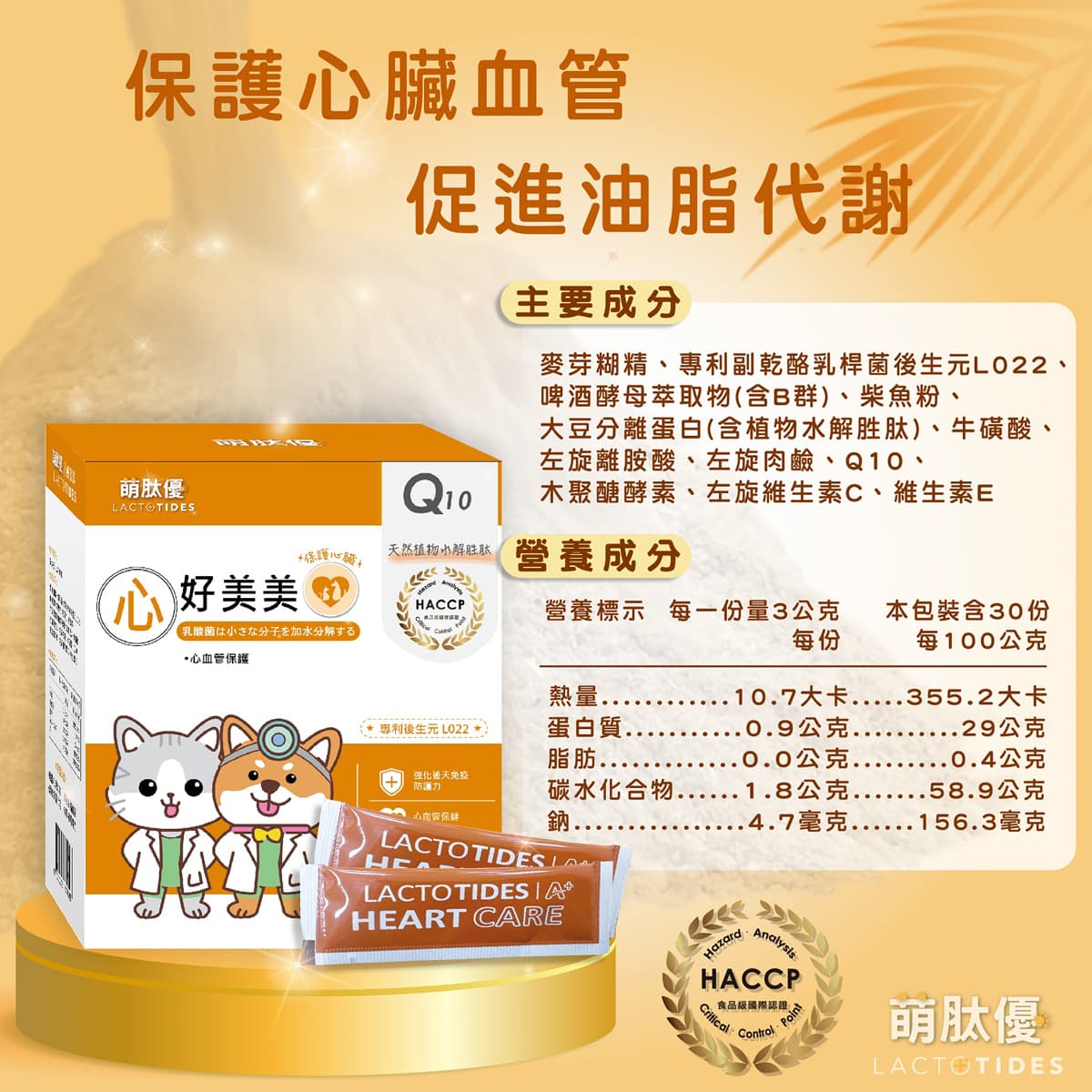 - 成分:麥芽糊精、專利副乾酪乳桿菌後生元 L022、啤酒酵母萃取物 (含 B 群)、柴魚粉、大豆分離蛋白 (含植物水解胜肽)、牛磺酸、左旋離胺酸、左旋肉鹼、Q10、木聚醣酵素、左旋維生素 C、維生素 E