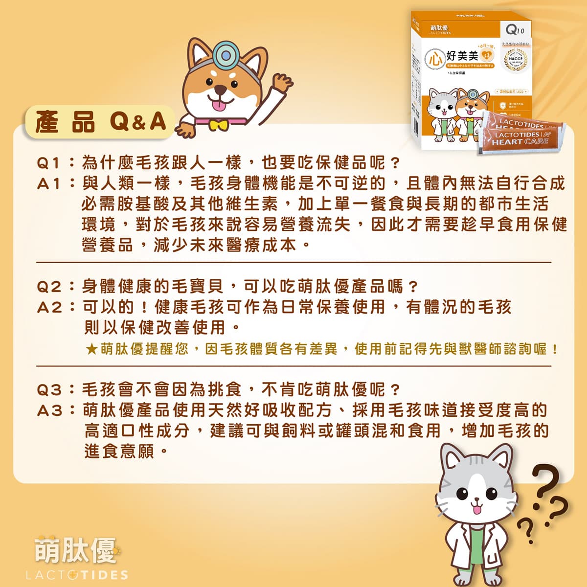 A5:建議從 6 個月齡後即可開始補充,越早建立日常心臟保健習慣,對毛孩的長期健康越有幫助。