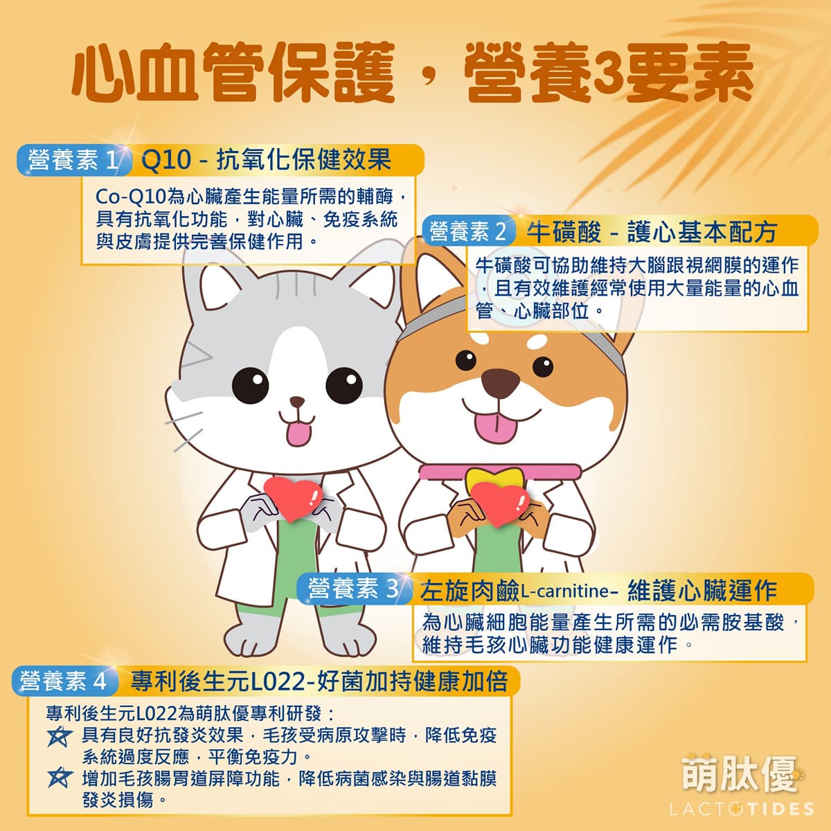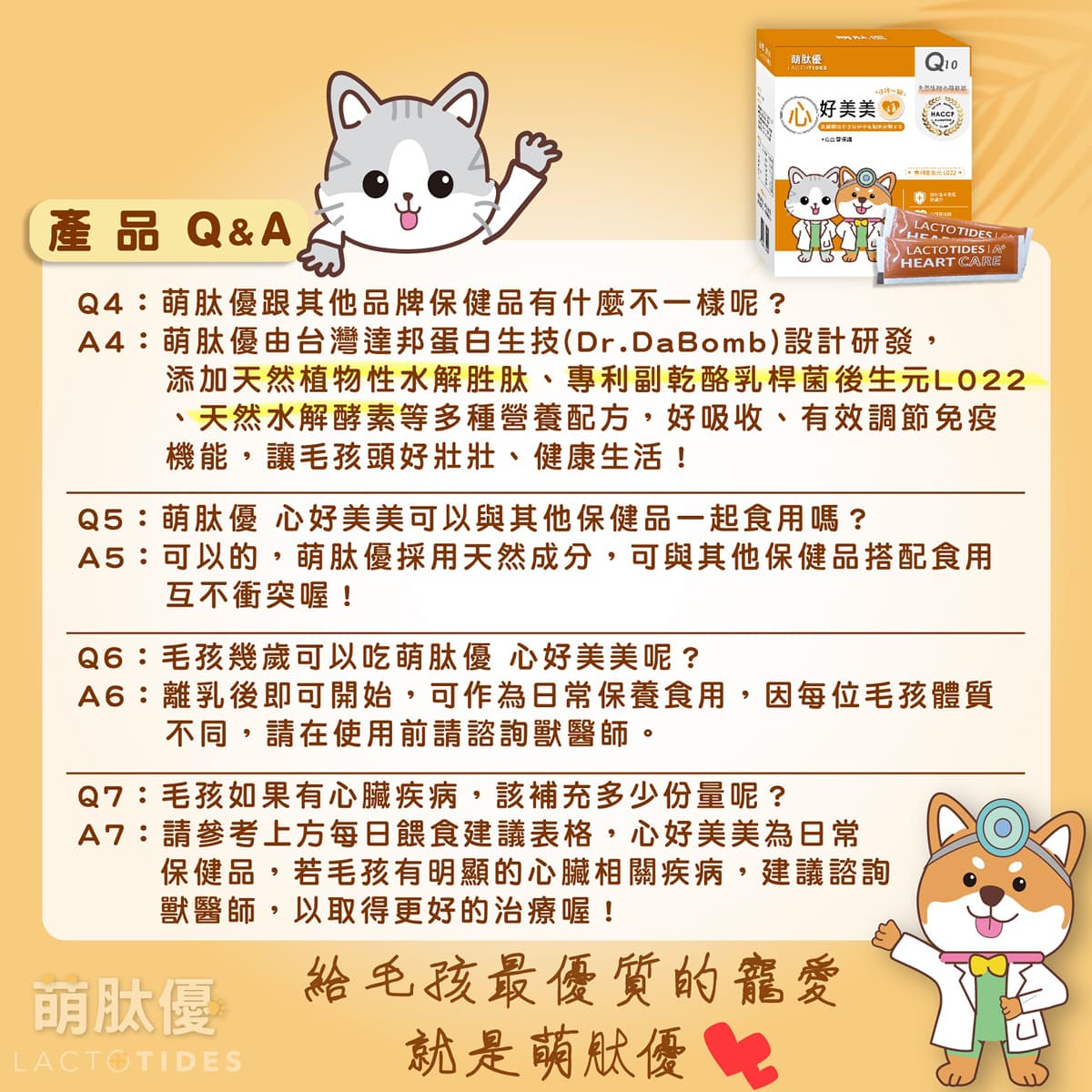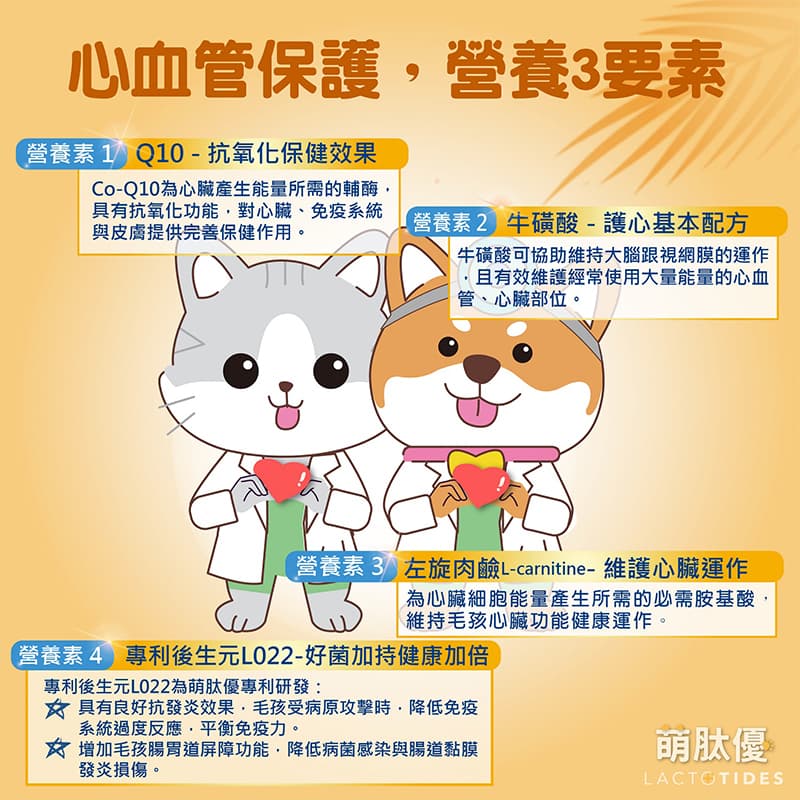 A4:萌肽優提供的配方結合專利後生元 L022 搭配 Q10、牛磺酸與左旋肉鹼,打造多重營養補充,一次守護心肌能量、免疫平衡與心血管健康,屬於全方位的寵物心臟營養補充品。